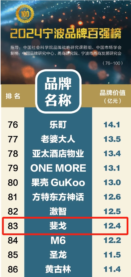 5月10日,备受瞩目的“2024宁波品牌百强榜”正式发布,斐戈集团凭借出色的市场表现和品牌影响力,以12.4亿元的品牌价值荣登榜单第83位,再次彰显了其在市场中的强大实力。