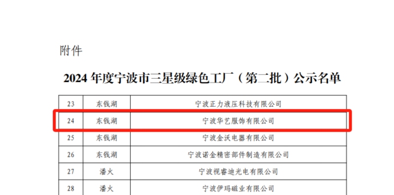 近日,宁波市鄞州区经济和信息化局公示了2024 年度宁波市三星级绿色工厂(第二批)名单,宁波华艺服饰有限公司位列其中。