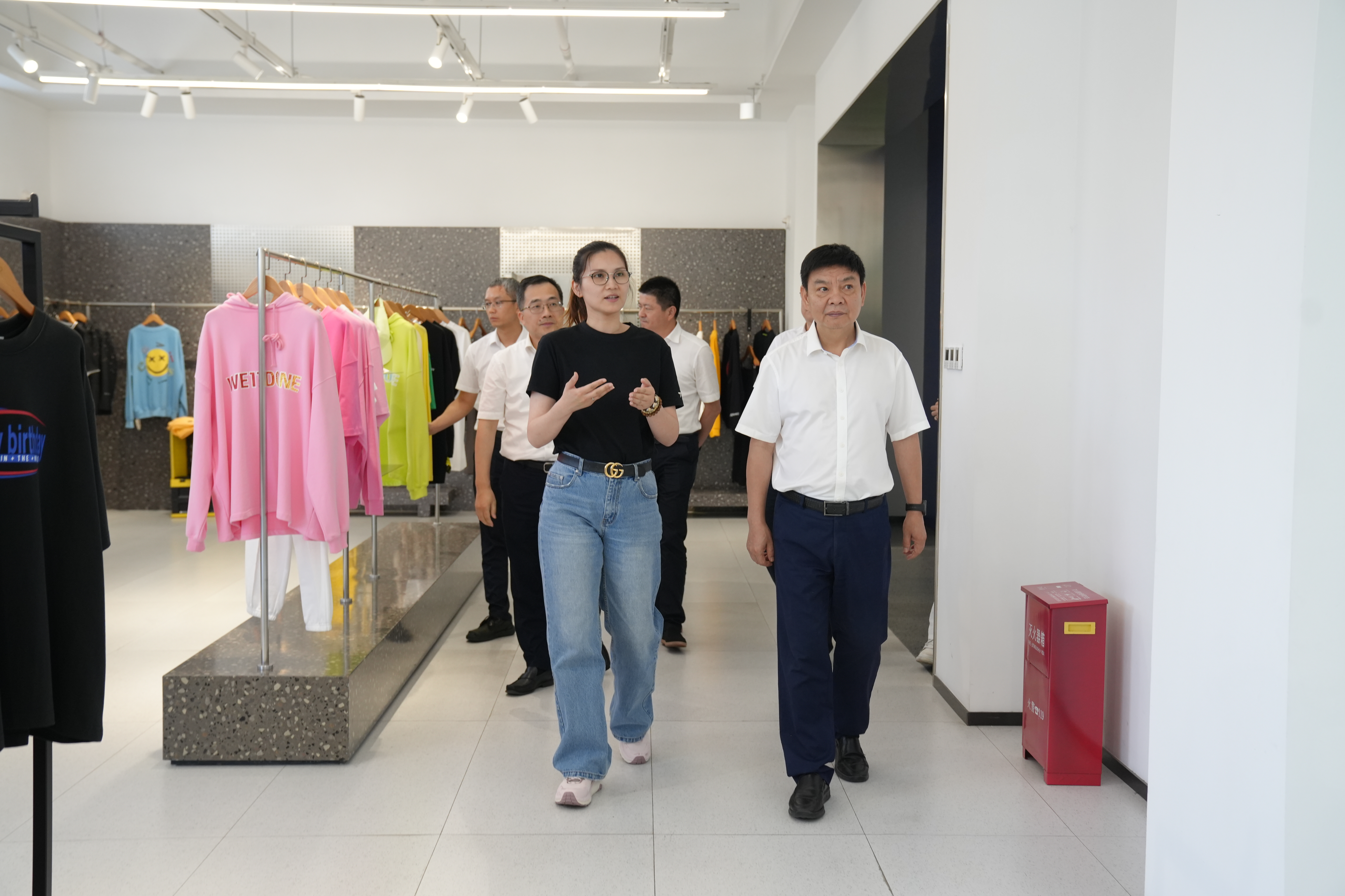 Director Zhang and the delegation conducted an on-site inspection of the enterprise's development history exhibition panels, industrial layout sandbox, Y11 brand display and sales center, Y11 fashion block, CEEC Premium Products Pavilion, and Yishanxi Coffee Shop. They gained a detailed understanding of FIOCCO Group's business management model and the composition of its business sectors, with a focus on investigating the full industrial chain empowerment services provided by the enterprise for innovation and entrepreneurship projects.