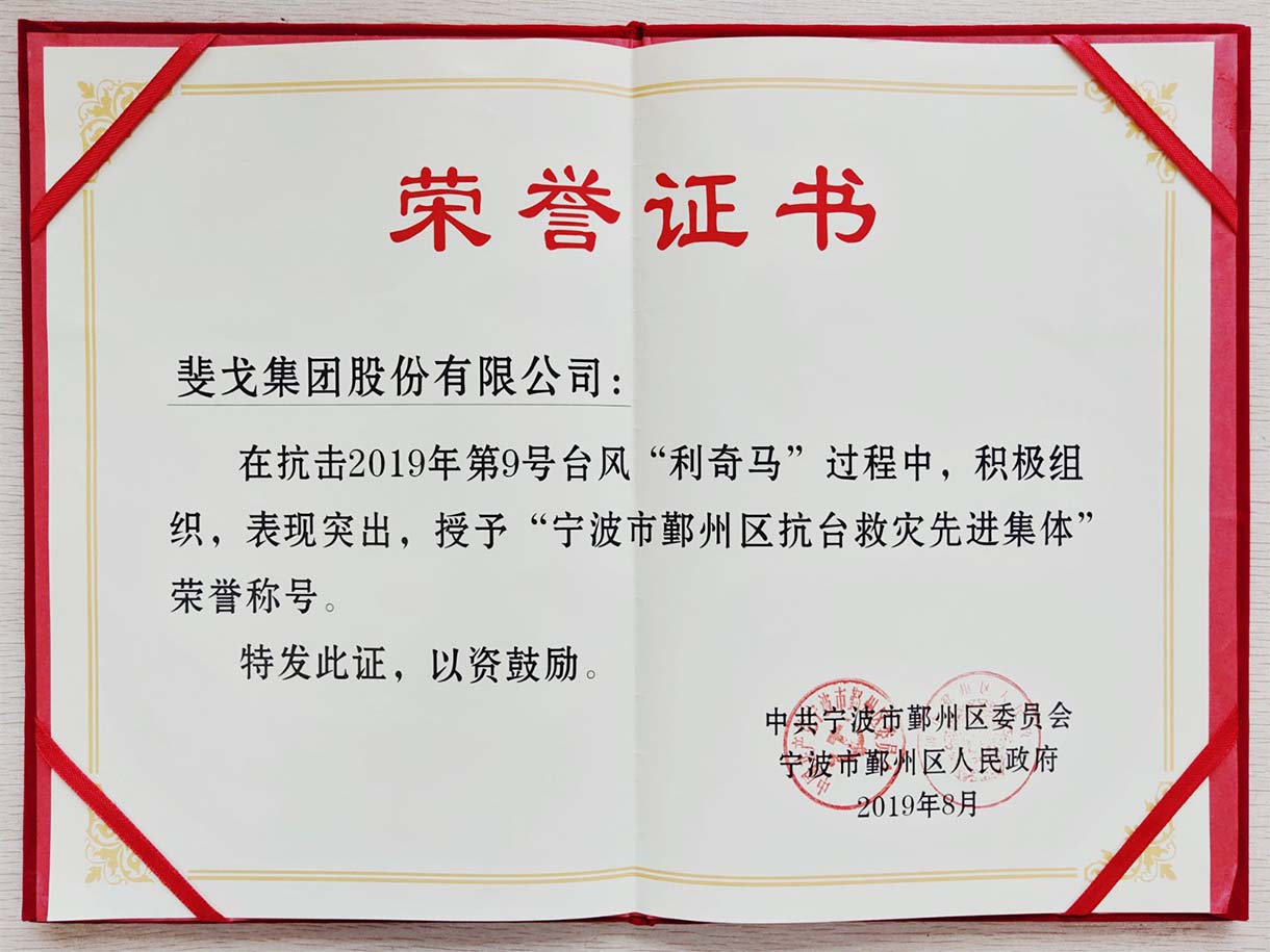 为总结抗台救灾成果经验,表彰在抗台救灾中涌现的先进个人和先进集体,20日下午,鄞州区抗台总结表彰大会在区文化艺术中心举行。会上,斐戈集团荣获“宁波市鄞州区抗台救灾先进集体”。