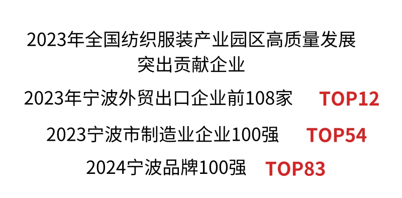 2021 年,集系统感知、信息集成、数据分析、AI 赋能于一体的 ——5G 数字化智能制造工厂正式投产。工厂打破传统生产车间布局,将空间划分为智能裁剪中心、技术研发中心、智能生产中心、智能管理中心,真正实现了全流程数字化智能方案。首批获得国家海关总署颁发的 “AEO 高级认证企业” 称号;荣获浙江省著名商标、知名商号、浙江出口名牌以及宁波市首批出口质量奖等诸多荣誉;通过了 WRAP、BSCI、SEDEX、STeP by OEKO-TEX® 等多项认证;还获得了几十个国际知名品牌的授权生产。